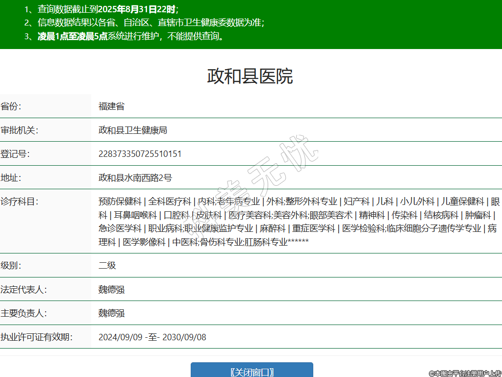省份:福建省審批機關(guān):政和縣衛(wèi)生健康局登記號:228373350725510151地址:政和縣水南西路2號診療科目:預(yù)防保健科 | 全科醫(yī)療科 | 內(nèi)科;老年病專業(yè) | 外科;整形外科專業(yè) | 婦產(chǎn)科 | 兒科 | 小兒外科 | 兒童保健科 | 眼科 | 耳鼻咽喉科 | 口腔科 | 皮膚科 | 醫(yī)療美容科;美容外科;眼部美容術(shù) | 精神科 | 傳染科 | 結(jié)核病科 | 腫瘤科 | 急診醫(yī)學(xué)科 | 職業(yè)病科;職業(yè)健康監(jiān)護(hù)專業(yè) | 麻醉科 | 重癥醫(yī)學(xué)科 | 醫(yī)學(xué)檢驗科;臨床細(xì)胞分子遺傳學(xué)專業(yè) | 病理科 | 醫(yī)學(xué)影像科 | 中醫(yī)科;骨傷科專業(yè);肛腸科專業(yè)******級別:二級法定代表人:魏德強主要負(fù)責(zé)人:魏德強執(zhí)業(yè)許可證有效期:2024/09/09 -至- 2030/09/08 -
