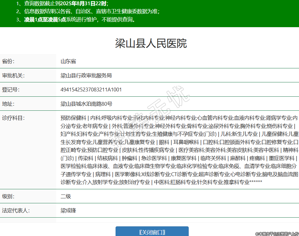省份:山東省審批機(jī)關(guān):梁山縣行政審批服務(wù)局登記號:49415425237083211A1001地址:梁山縣城水泊南路80號診療科目:預(yù)防保健科 | 內(nèi)科;呼吸內(nèi)科專業(yè);消化內(nèi)科專業(yè);神經(jīng)內(nèi)科專業(yè);心血管內(nèi)科專業(yè);血液內(nèi)科專業(yè);腎病學(xué)專業(yè);內(nèi)分泌專業(yè);老年病專業(yè) | 外科;普通外科專業(yè);神經(jīng)外科專業(yè);骨科專業(yè);泌尿外科專業(yè);胸外科專業(yè);燒傷科專業(yè) | 婦產(chǎn)科;婦科專業(yè);產(chǎn)科專業(yè);計(jì)劃生育專業(yè);生殖健康與不孕癥專業(yè)(門診) | 兒科;新生兒專業(yè) | 兒童保健科;兒童生長發(fā)育專業(yè);兒童營養(yǎng)專業(yè);兒童康復(fù)專業(yè) | 眼科 | 耳鼻咽喉科 | 口腔科;口腔頜面外科專業(yè);口腔修復(fù)專業(yè);口腔正畸專業(yè);預(yù)防口腔專業(yè) | 皮膚科;性傳播疾病專業(yè) | 醫(yī)療美容科;美容外科;美容皮膚科;美容中醫(yī)科 | 精神科(門診) | 傳染科 | 結(jié)核病科 | 腫瘤科 | 急診醫(yī)學(xué)科 | 康復(fù)醫(yī)學(xué)科 | 臨終關(guān)懷科 | 麻醉科 | 疼痛科 | 重癥醫(yī)學(xué)科 | 醫(yī)學(xué)檢驗(yàn)科;臨床體液、血液專業(yè);臨床微生物學(xué)專業(yè);臨床化學(xué)檢驗(yàn)專業(yè);臨床免疫、血清學(xué)專業(yè);臨床細(xì)胞分子遺傳學(xué)專業(yè) | 病理科 | 醫(yī)學(xué)影像科;X線診斷專業(yè);CT診斷專業(yè);超聲診斷專業(yè);心電診斷專業(yè);腦電及腦血流圖診斷專業(yè);介入放射學(xué)專業(yè);放射治療專業(yè) | 中醫(yī)科;肛腸科專業(yè);針灸科專業(yè);推拿科專業(yè)******級別:二級法定代表人:梁成鋒主要負(fù)責(zé)人:梁成鋒執(zhí)業(yè)許可證有效期:2025/04/27 -至- 2033/12/30 -