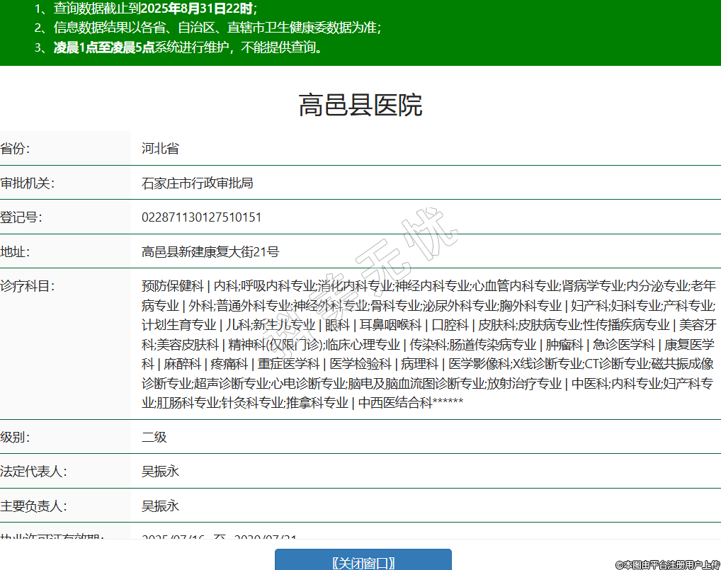 省份:河北省審批機(jī)關(guān):石家莊市行政審批局登記號:022871130127510151地址:高邑縣新建康復(fù)大街21號診療科目:預(yù)防保健科 | 內(nèi)科;呼吸內(nèi)科專業(yè);消化內(nèi)科專業(yè);神經(jīng)內(nèi)科專業(yè);心血管內(nèi)科專業(yè);腎病學(xué)專業(yè);內(nèi)分泌專業(yè);老年病專業(yè) | 外科;普通外科專業(yè);神經(jīng)外科專業(yè);骨科專業(yè);泌尿外科專業(yè);胸外科專業(yè) | 婦產(chǎn)科;婦科專業(yè);產(chǎn)科專業(yè);計(jì)劃生育專業(yè) | 兒科;新生兒專業(yè) | 眼科 | 耳鼻咽喉科 | 口腔科 | 皮膚科;皮膚病專業(yè);性傳播疾病專業(yè) | 美容牙科;美容皮膚科 | 精神科(僅限門診);臨床心理專業(yè) | 傳染科;腸道傳染病專業(yè) | 腫瘤科 | 急診醫(yī)學(xué)科 | 康復(fù)醫(yī)學(xué)科 | 麻醉科 | 疼痛科 | 重癥醫(yī)學(xué)科 | 醫(yī)學(xué)檢驗(yàn)科 | 病理科 | 醫(yī)學(xué)影像科;X線診斷專業(yè);CT診斷專業(yè);磁共振成像診斷專業(yè);超聲診斷專業(yè);心電診斷專業(yè);腦電及腦血流圖診斷專業(yè);放射治療專業(yè) | 中醫(yī)科;內(nèi)科專業(yè);婦產(chǎn)科專業(yè);肛腸科專業(yè);針灸科專業(yè);推拿科專業(yè) | 中西醫(yī)結(jié)合科******級別:二級法定代表人:吳振永主要負(fù)責(zé)人:吳振永執(zhí)業(yè)許可證有效期:2025/07/16 -至- 2030/07/31 -