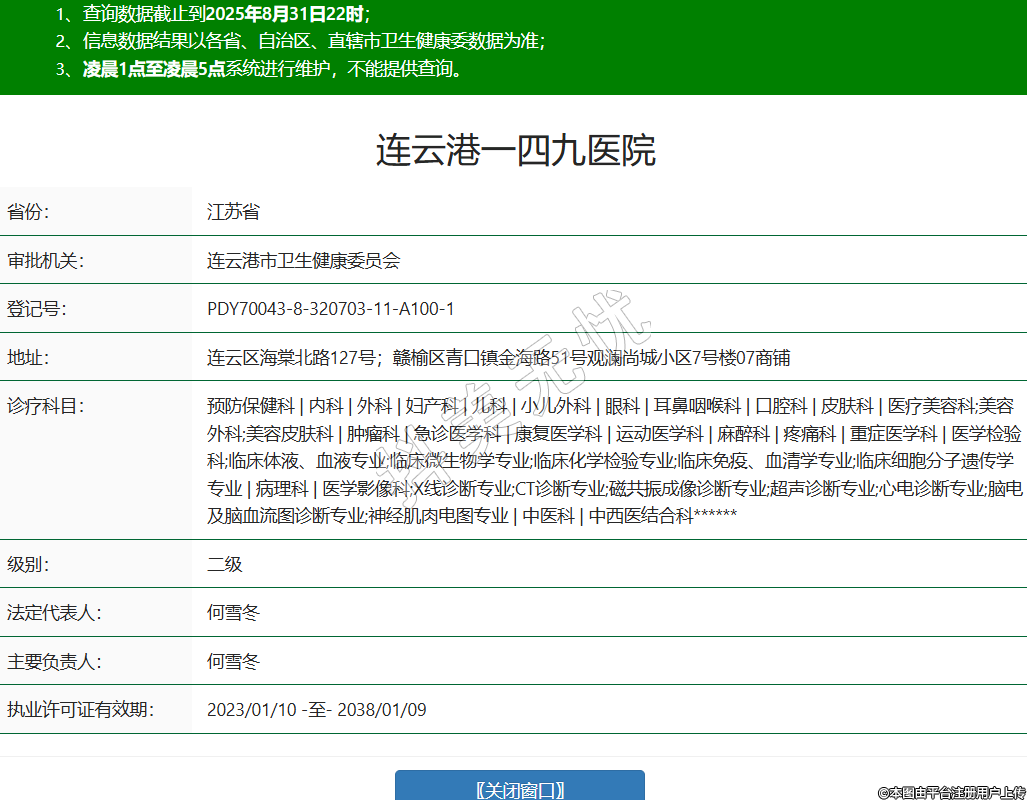 省份:江蘇省審批機關:連云港市衛(wèi)生健康委員會登記號:PDY70043-8-320703-11-A100-1地址:連云區(qū)海棠北路127號;贛榆區(qū)青口鎮(zhèn)金海路51號觀瀾尚城小區(qū)7號樓07商鋪診療科目:預防保健科 | 內科 | 外科 | 婦產科 | 兒科 | 小兒外科 | 眼科 | 耳鼻咽喉科 | 口腔科 | 皮膚科 | 醫(yī)療美容科;美容外科;美容皮膚科 | 腫瘤科 | 急診醫(yī)學科 | 康復醫(yī)學科 | 運動醫(yī)學科 | 麻醉科 | 疼痛科 | 重癥醫(yī)學科 | 醫(yī)學檢驗科;臨床體液、血液專業(yè);臨床微生物學專業(yè);臨床化學檢驗專業(yè);臨床免疫、血清學專業(yè);臨床細胞分子遺傳學專業(yè) | 病理科 | 醫(yī)學影像科;X線診斷專業(yè);CT診斷專業(yè);磁共振成像診斷專業(yè);超聲診斷專業(yè);心電診斷專業(yè);腦電及腦血流圖診斷專業(yè);神經肌肉電圖專業(yè) | 中醫(yī)科 | 中西醫(yī)結合科******級別:二級法定代表人:何雪冬主要負責人:何雪冬執(zhí)業(yè)許可證有效期:2023/01/10 -至- 2038/01/09 -