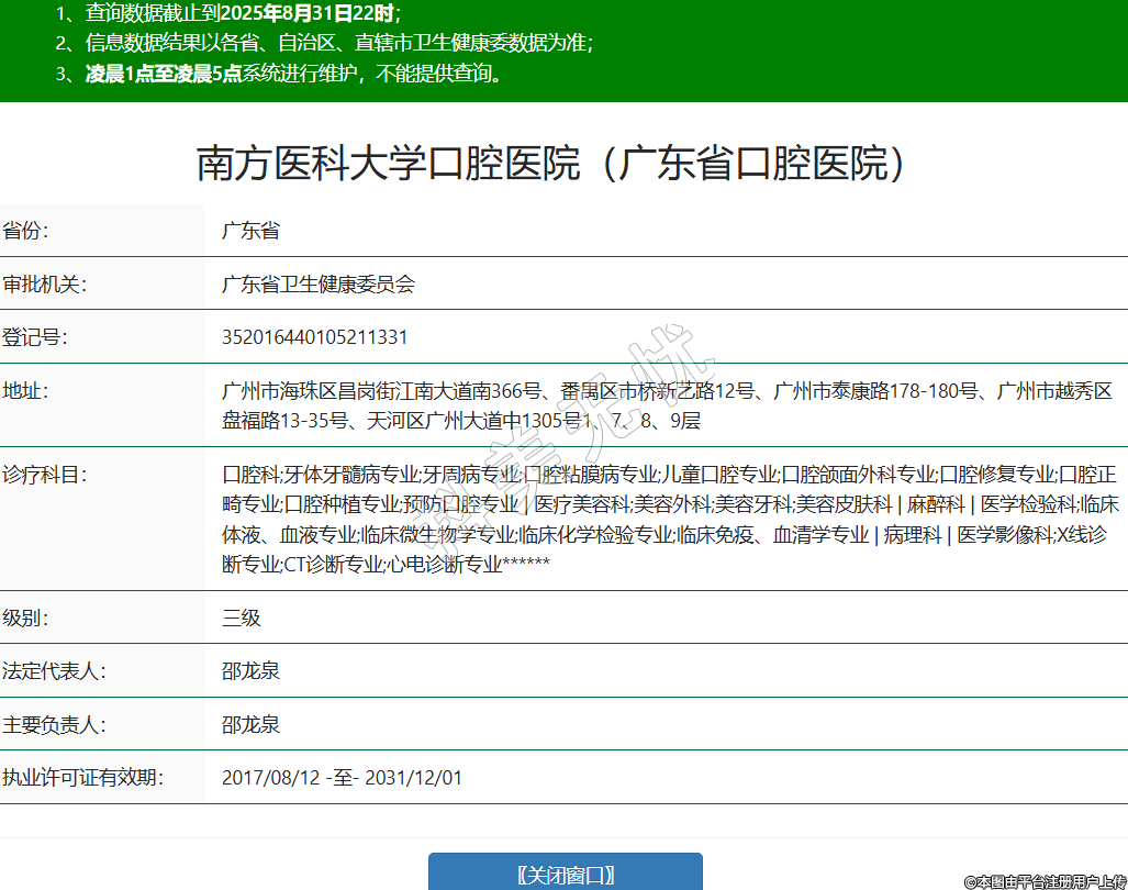 省份:廣東省審批機(jī)關(guān):廣東省衛(wèi)生健康委員會登記號:352016440105211331地址:廣州市海珠區(qū)昌崗街江南大道南366號、番禺區(qū)市橋新藝路12號、廣州市泰康路178-180號、廣州市越秀區(qū)盤福路13-35號、天河區(qū)廣州大道中1305號1、7、8、9層診療科目:口腔科;牙體牙髓病專業(yè);牙周病專業(yè);口腔粘膜病專業(yè);兒童口腔專業(yè);口腔頜面外科專業(yè);口腔修復(fù)專業(yè);口腔正畸專業(yè);口腔種植專業(yè);預(yù)防口腔專業(yè) | 醫(yī)療美容科;美容外科;美容牙科;美容皮膚科 | 麻醉科 | 醫(yī)學(xué)檢驗(yàn)科;臨床體液、血液專業(yè);臨床微生物學(xué)專業(yè);臨床化學(xué)檢驗(yàn)專業(yè);臨床免疫、血清學(xué)專業(yè) | 病理科 | 醫(yī)學(xué)影像科;X線診斷專業(yè);CT診斷專業(yè);心電診斷專業(yè)******級別:三級法定代表人:邵龍泉主要負(fù)責(zé)人:邵龍泉執(zhí)業(yè)許可證有效期:2017/08/12 -至- 2031/12/01 -