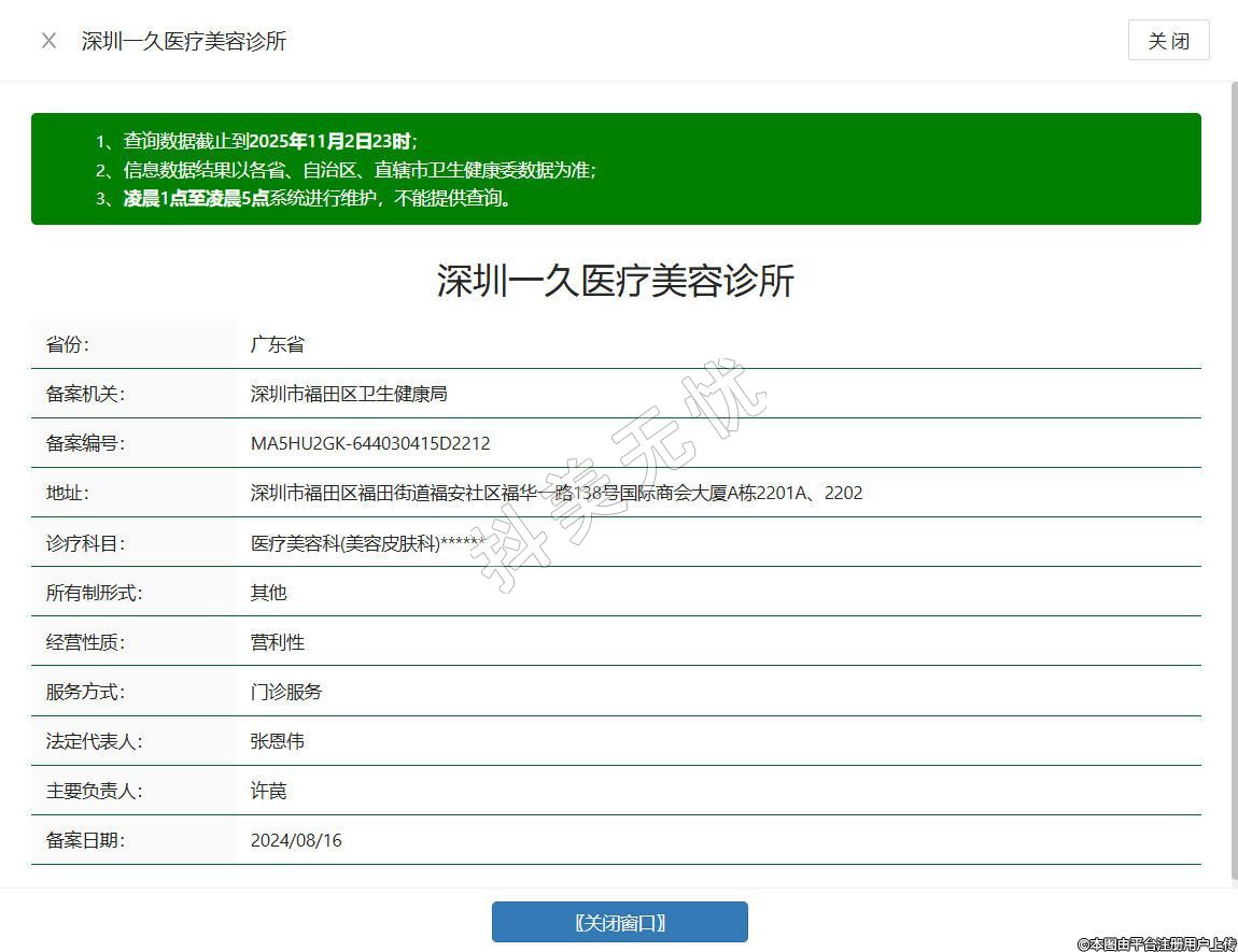深圳一久醫(yī)療美容診所成立于2023年,位于深圳市福田區(qū)福田街道福安社區(qū)福華一路138號國際商會大廈A棟2201A、2202,是一家資質齊全的專業(yè)醫(yī)療美容機構,持有《醫(yī)療機構執(zhí)業(yè)許可證》,嚴格按照核準診療科目開展醫(yī)療美容服務等相關業(yè)務,秉持 “誠信為本,以人為本” 的經營理念,匯聚具備合法執(zhí)業(yè)資質的醫(yī)療團隊,以規(guī)范的診療流程,為有需求的消費者提供安全、合規(guī)的醫(yī)療美容相關服務。
