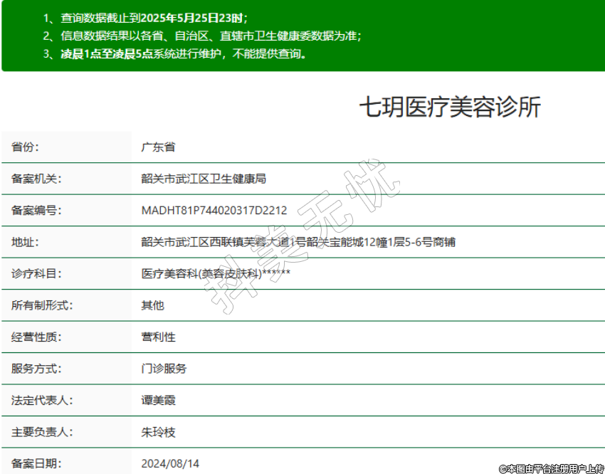省份:廣東省備案機關(guān):韶關(guān)市武江區(qū)衛(wèi)生健康局備案編號:MADHT81P744020317D2212地址:韶關(guān)市武江區(qū)西聯(lián)鎮(zhèn)芙蓉大道1號韶關(guān)寶能城12幢1層5-6號商鋪診療科目:醫(yī)療美容科(美容皮膚科)******所有制形式:其他經(jīng)營性質(zhì):營利性服務(wù)方式:門診服務(wù)法定代表人:譚美霞主要負(fù)責(zé)人:朱玲枝備案日期:2024/08/14
