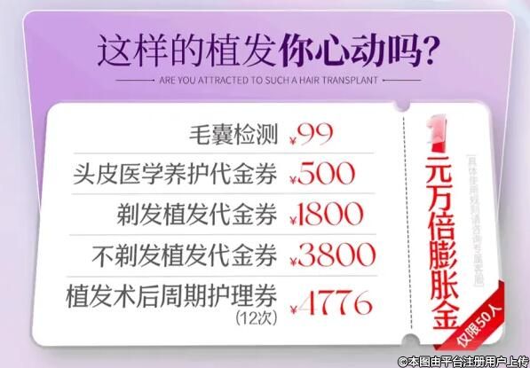 哇,搶了這個膨脹金植發(fā)好劃算啊,上次我去植發(fā)花了幾萬塊錢,就是因?yàn)闆]有活動才那么貴的,后面過幾天知道有活動才后悔不已,早知道就不植發(fā)那么早了,花了那么多錢。