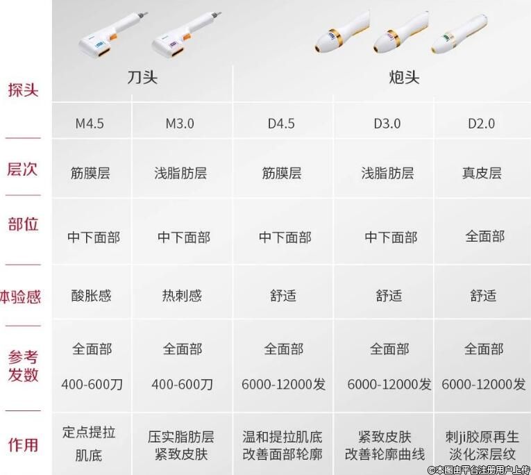 刀頭M4.5+刀頭M3.0+炮頭D4.5+炮頭D3.0(俗稱:2刀2炮)適合:中重度面部松弛下垂、皺紋嚴(yán)重、肉肉臉、下頜脂肪堆積、眼周松弛、口角囊?guī)?、雙下巴、法令紋等