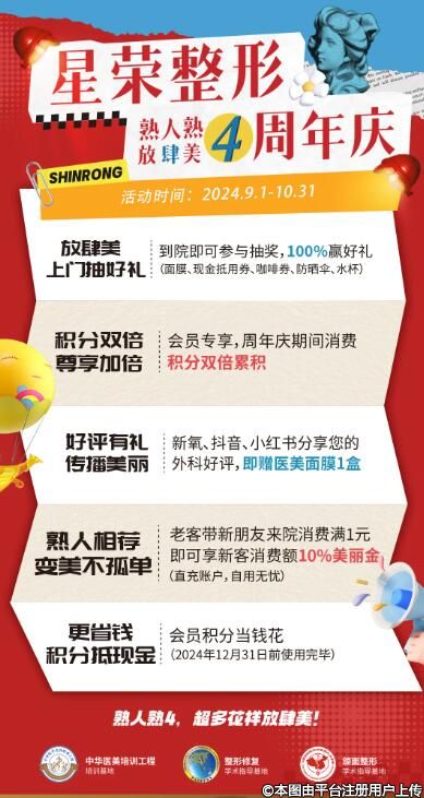 9月1日-10月31日,“熟人熟4放肆美”星榮整形外科醫(yī)院周年慶典盛大啟幕。星榮“熟人節(jié)”精心策劃了一系列豐富多彩、極具吸引力的福利活動,讓每一位踏入星榮的顧客都能感受到前所未有的尊貴體驗。