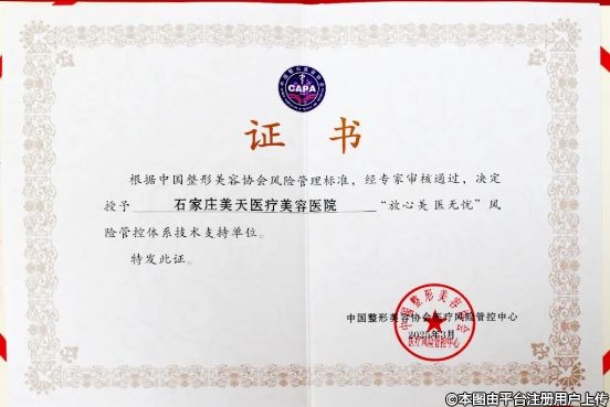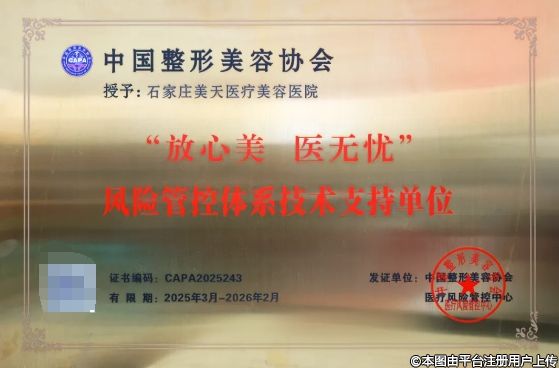 2025年3月,根據(jù)中國(guó)整形美容協(xié)會(huì)風(fēng)險(xiǎn)管理標(biāo)準(zhǔn),經(jīng)專(zhuān)家審核通過(guò),石家莊美天醫(yī)療美容醫(yī)院被授予“放心美 醫(yī)無(wú)憂(yōu)”風(fēng)險(xiǎn)管控體系技術(shù)支持單位。中國(guó)整形美容協(xié)會(huì)醫(yī)療風(fēng)險(xiǎn)管控中心為石家莊美天發(fā)放證書(shū)。