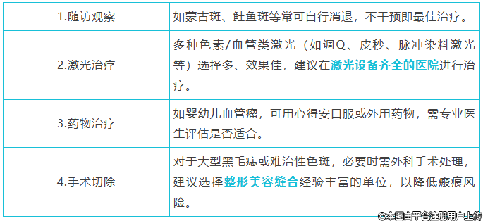 不同色斑的治療方法不同,首先需要經(jīng)驗(yàn)豐富的醫(yī)生會(huì)先判斷類(lèi)型,再?zèng)Q定處理方式,一般治療方式分為以下4種: