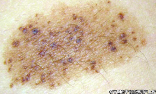 背景斑邊界清楚,上面的深色小點可以是各種痣,如交界痣、復(fù)合痣、皮內(nèi)痣、藍痣、日光性雀斑樣痣或先天性色素痣。